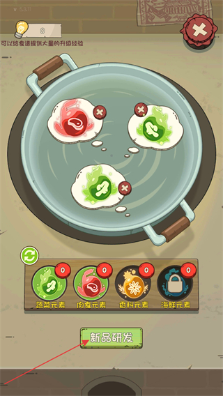 2、在研發(fā)界面選擇對應(yīng)元素后點擊新品研發(fā)按鈕,嘗試制作新菜品來擴充面館的菜單選項提升經(jīng)營多樣性。