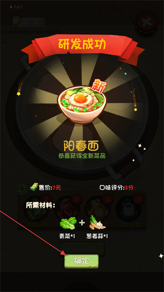 3、研發(fā)成功后獲得新菜品陽春面,點擊界面中的確定按鈕,將該菜品添加到面館的可售賣菜單中。