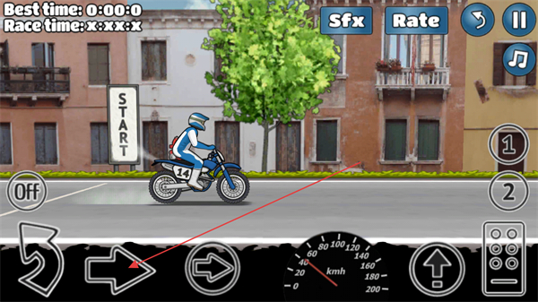 1、操控方向按鈕控制摩托移動(dòng),在賽道上啟動(dòng)行駛,開(kāi)始特技挑戰(zhàn)。