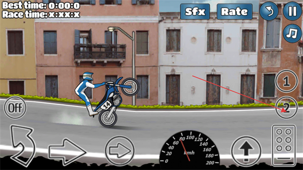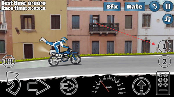 2、調(diào)整摩托姿態(tài),做出特技動(dòng)作,同時(shí)留意速度表,保持行駛節(jié)奏。