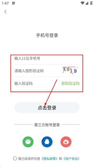 3、在登錄頁(yè)面,填寫(xiě)手機(jī)號(hào)、圖形驗(yàn)證碼,驗(yàn)證碼后,點(diǎn)擊登錄,完成賬號(hào)登錄。