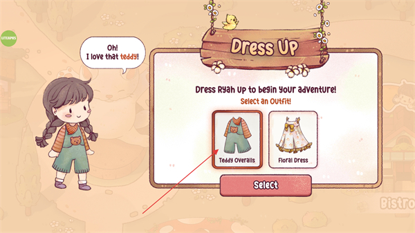 1、在游戲初始界面界面,為角色選擇服裝款式,點(diǎn)擊下方的Select按鈕,即可完成角色裝扮并開啟后續(xù)的冒險流程。