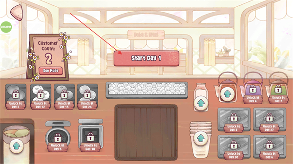3、在Bistro的經(jīng)營準(zhǔn)備界面,點(diǎn)擊屏幕中間的按鈕,即可開啟第一天的經(jīng)營工作,著手處理顧客的訂單需求。