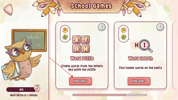2、在SchoolGames界面選擇WordPuzzle項目,點擊下方的PlayLevel1按鈕,進入該解謎關(guān)卡的第一關(guān)。