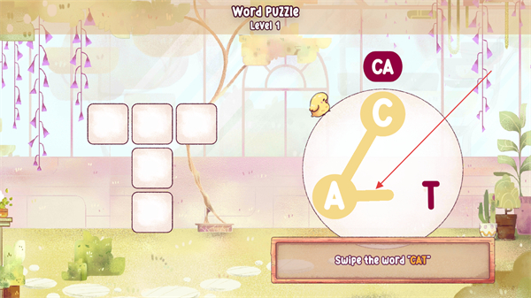 3、在游戲關(guān)卡中,按照提示滑動字母C、A、T,組成單詞CAT來完成本關(guān)卡的解謎任務(wù)。