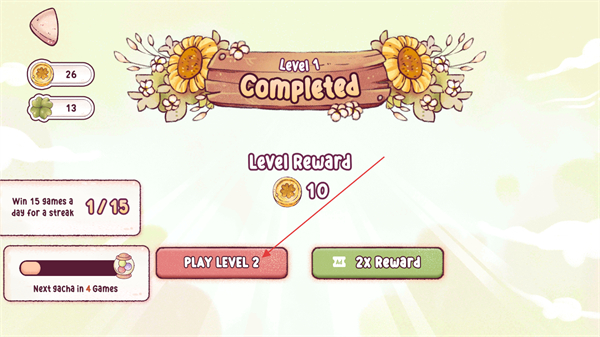 4、關(guān)卡完成后獲得對應(yīng)獎勵,點擊界面中的PlayLevel2按鈕,即可進入該解謎項目的第二關(guān)繼續(xù)挑戰(zhàn)。