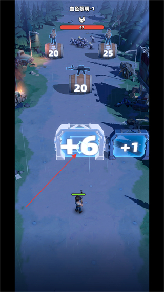 1、這是血色黎明-1關(guān)卡的初始戰(zhàn)斗界面,移動(dòng)角色獲取標(biāo)有+6的增益道具可獲取戰(zhàn)斗加成,為后續(xù)對(duì)抗敵人積累優(yōu)勢(shì)。