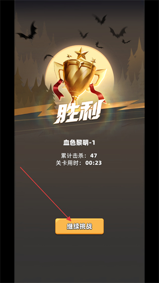 4、關(guān)卡的勝利界面展示了累計(jì)擊殺數(shù)與關(guān)卡用時(shí),點(diǎn)擊繼續(xù)挑戰(zhàn)按鈕,即可進(jìn)入后續(xù)關(guān)卡繼續(xù)進(jìn)行戰(zhàn)斗挑戰(zhàn)。