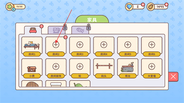2、家具活動界面分類展示了可裝飾的區(qū)域房間、碼頭、柜臺等,點擊房間2對應(yīng)的+按鈕,即可進(jìn)入該房間的家具選購頁面。