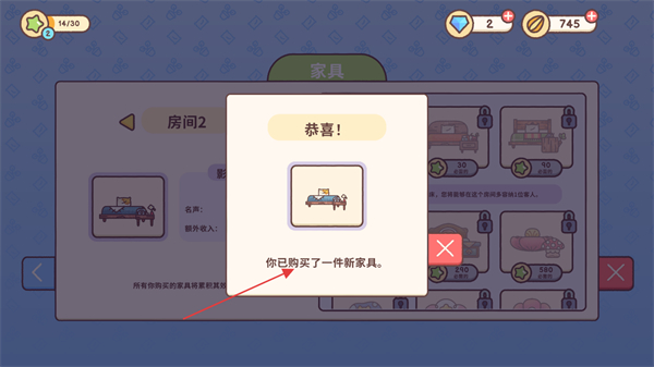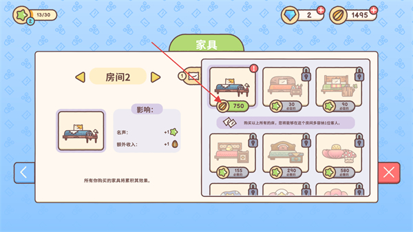 3、這是房間2的家具選購界面,消耗當(dāng)前床需750貨幣購買家具,解鎖房間的接待能力,增強店鋪的經(jīng)營效率。