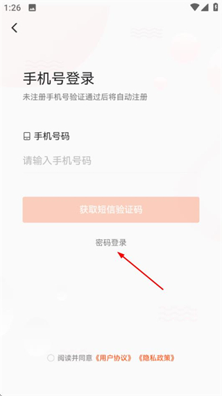 3、在手機(jī)號(hào)登錄頁(yè)面,點(diǎn)擊密碼登錄選項(xiàng),進(jìn)入密碼登錄頁(yè)面。
