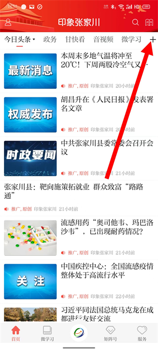 1、打開印象張家川,點(diǎn)擊頂部導(dǎo)航欄的加號,進(jìn)入所有欄目界面。