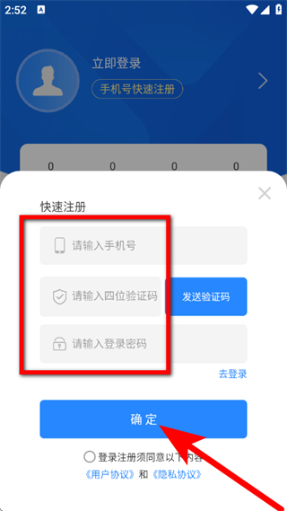 4、在快速注冊頁面,輸入手機(jī)號,輸入登錄密碼,勾選后,點(diǎn)擊確定,完成注冊。