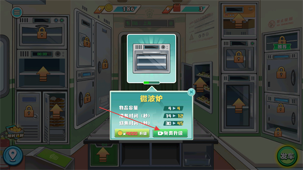 1、在餐食準(zhǔn)備環(huán)節(jié),在微波爐功能界面,可查看其物品容量、加熱時(shí)間等參數(shù),點(diǎn)擊升級(jí)按鈕能提升設(shè)備性能。