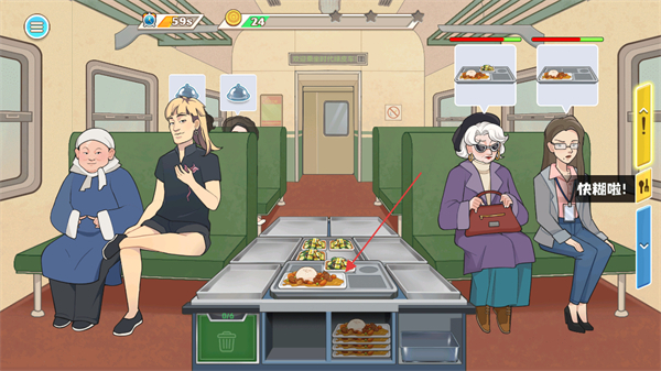 2、進(jìn)入乘客車廂后,及時(shí)將對(duì)應(yīng)餐食配送至有需求的乘客處,避免超時(shí)影響關(guān)卡的評(píng)分與獎(jiǎng)勵(lì)獲取。