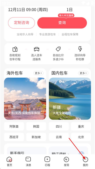 1、在皇包車旅行首頁,點(diǎn)擊底部的我的選項(xiàng),進(jìn)入個(gè)人中心頁面。