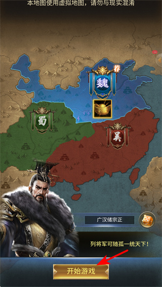 1、在游戲啟動(dòng)界面,點(diǎn)擊開始游戲按鈕可進(jìn)入三國(guó)題材的策略玩法,這是開啟勢(shì)力發(fā)展、領(lǐng)地?cái)U(kuò)張的基礎(chǔ)操作,通過招募武將推進(jìn)統(tǒng)一進(jìn)程。