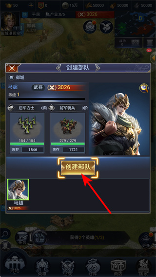 3、在創(chuàng)建部隊(duì)界面,選擇武將如馬超并搭配對(duì)應(yīng)兵種盾斧方士,點(diǎn)擊創(chuàng)建部隊(duì)可完成軍隊(duì)編組,這是發(fā)起征戰(zhàn)、攻占領(lǐng)地的前置準(zhǔn)備。