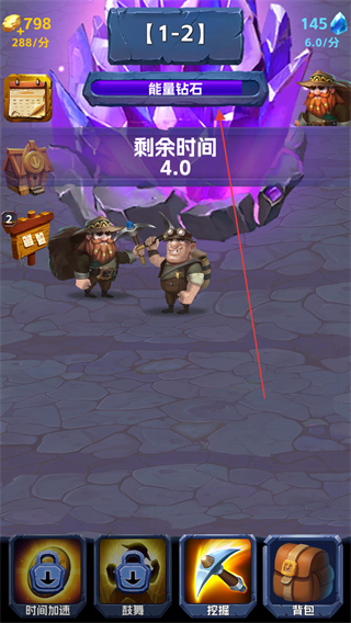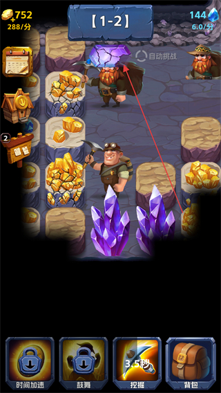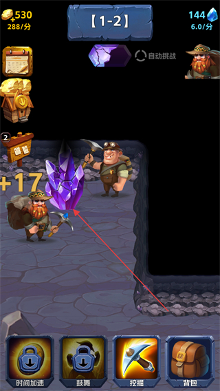 1、在1-2關(guān)卡中,點擊紫色水晶,礦工開采獲得+17資源,積累金幣與鉆石。