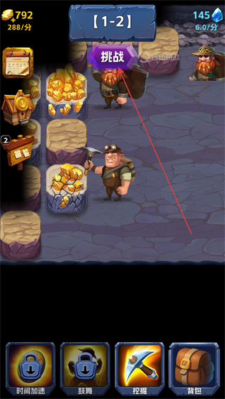 2、使用挖掘技能,礦工持續(xù)開采礦石堆,快速獲取大量金幣資源。