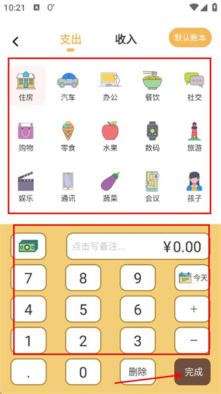 3、在記賬頁面選擇支出分類、填寫金額后,點(diǎn)擊完成按鈕完成本次記賬操作。