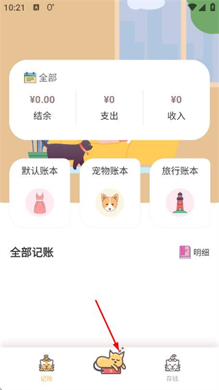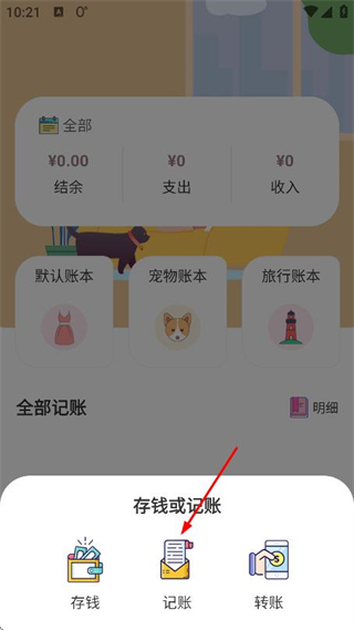 1、在記賬應(yīng)用首頁點(diǎn)擊底部中間的按鈕,彈出存錢或記賬選項(xiàng)菜單。