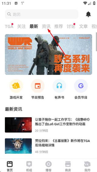 1、在應(yīng)用首頁點擊頂部的資訊標(biāo)簽,切換到資訊頁面。