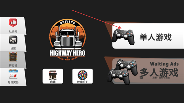 1、這是車(chē)手公路英雄主界面,點(diǎn)擊單人游戲可進(jìn)入單人游玩模式,界面還設(shè)有店鋪等功能入口供你使用。