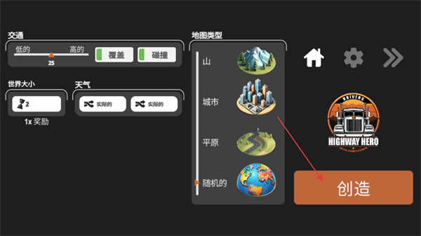 2、在該游戲的設(shè)置界面,可調(diào)整交通、地圖類(lèi)型等參數(shù),完成設(shè)置后點(diǎn)擊創(chuàng)造按鈕即可進(jìn)入對(duì)應(yīng)的游戲模式。