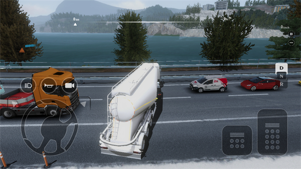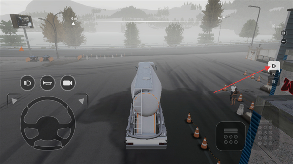 4、這是游戲的駕駛操作界面,選擇D檔可控制車(chē)輛進(jìn)入前進(jìn)狀態(tài),搭配方向盤(pán)等控件可完成卡車(chē)的駕駛操作。