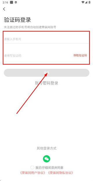 3、在登錄頁面填寫手機號和驗證碼,勾選協(xié)議后,點擊登錄完成賬號登錄操作。