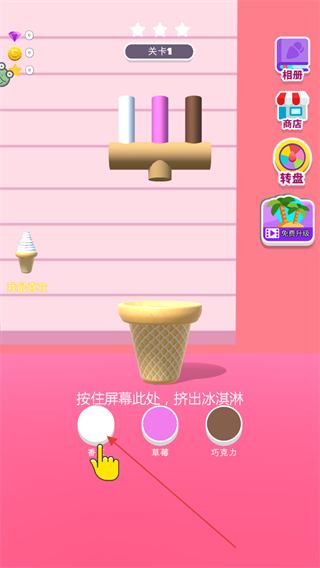 1、按住屏幕對應(yīng)位置,選擇香草口味,擠出冰淇淋至甜筒中。