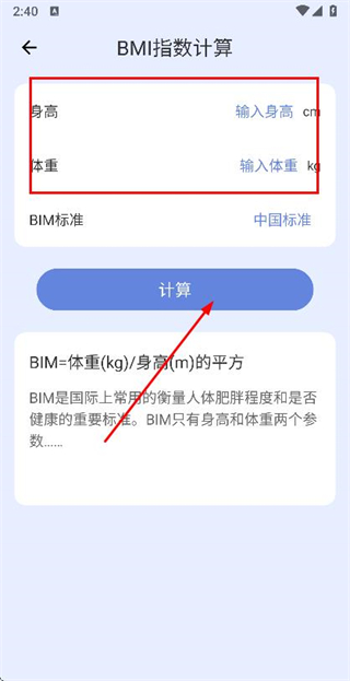 3、在BMI指數(shù)計算頁面填寫身高和體重信息后,點擊計算按鈕完成BMI指數(shù)的計算操作。