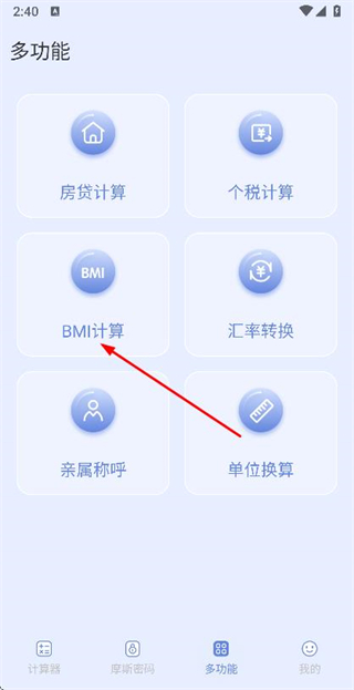 2、在多功能頁面點擊BMI計算選項,進入BMI指數(shù)計算頁面。