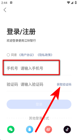 3、在登錄注冊(cè)頁面,輸入手機(jī)號(hào),點(diǎn)擊獲取驗(yàn)證碼。