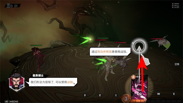 2、按照提示滑動(dòng)技能卡片來觸發(fā)技能,這是釋放招式的基礎(chǔ)操作,滑動(dòng)后可激活技能的效果,借助技能的范圍或單體傷害,提升戰(zhàn)斗的輸出效率。