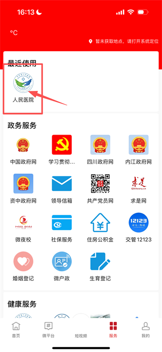 2、在服務(wù)頁(yè)面,點(diǎn)擊最近使用里的人民醫(yī)院選項(xiàng),進(jìn)入醫(yī)院服務(wù)頁(yè)面。