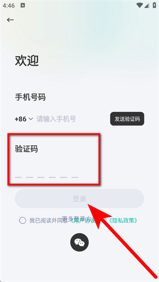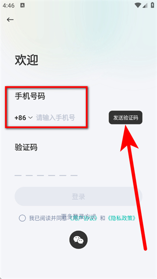 3、在登錄頁(yè)面,輸入手機(jī)號(hào),點(diǎn)擊發(fā)送驗(yàn)證碼。