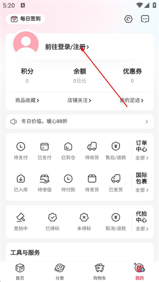 2、在我的頁(yè)面,點(diǎn)擊前往登錄/注冊(cè)選項(xiàng),進(jìn)入登錄頁(yè)面。