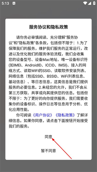 1、在服務(wù)協(xié)議和隱私政策彈窗中,點(diǎn)擊同意,進(jìn)入應(yīng)用。