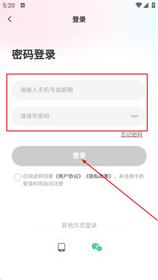 4、在密碼登錄界面,填寫手機(jī)號(hào)或郵箱和密碼,點(diǎn)擊登錄完成賬號(hào)登錄。
