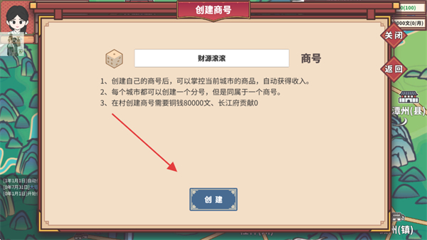 3、進入創(chuàng)建商號頁面,查看創(chuàng)建所需條件為銅錢80000文,確認資源滿足后找到創(chuàng)建按鈕。