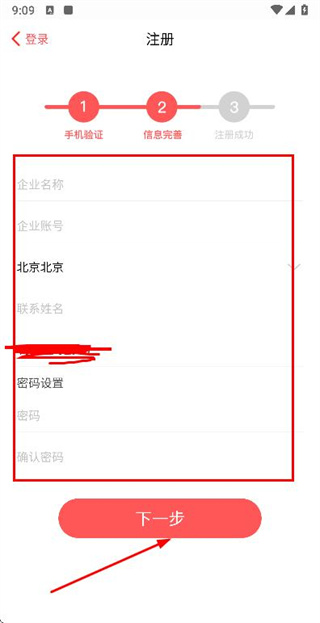 3、在注冊(cè)的信息完善頁(yè)面填寫所需信息后,點(diǎn)擊下一步進(jìn)入注冊(cè)成功頁(yè)面。