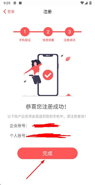 4、在注冊(cè)成功頁(yè)面點(diǎn)擊完成按鈕,結(jié)束整個(gè)注冊(cè)流程。