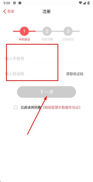 2、在注冊(cè)的手機(jī)驗(yàn)證頁(yè)面填寫手機(jī)號(hào)與驗(yàn)證碼,勾選協(xié)議后點(diǎn)擊下一步,進(jìn)入信息完善頁(yè)面。
