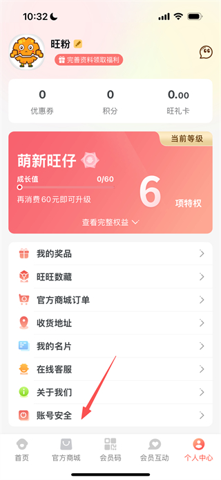 1、在旺仔俱樂部首頁,點擊底部的個人中心選項,進入個人中心頁面。