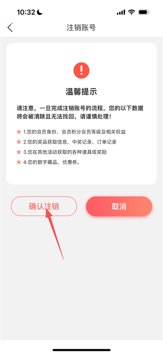 5、在溫馨提示頁面,點擊確認注銷按鈕,完成賬號注銷操作。
