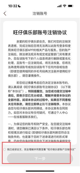 4、在注銷協(xié)議頁面,勾選同意協(xié)議后點擊下一步,進入溫馨提示頁面。