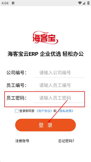 2、在登錄頁(yè)面,填寫請(qǐng)輸入公司編號(hào)對(duì)應(yīng)的內(nèi)容,以及員工編號(hào)對(duì)應(yīng)的信息。