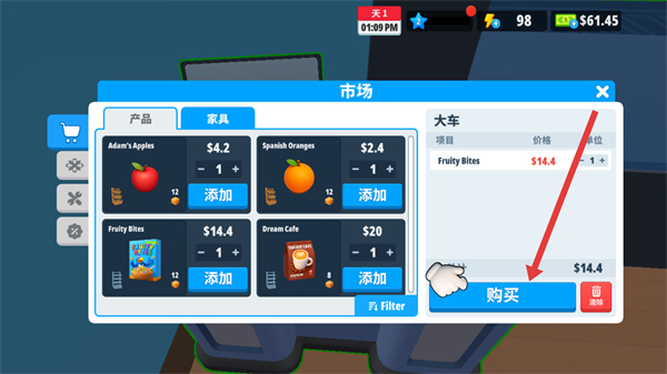 1、點(diǎn)擊右下角的按鈕,打開采購界面,選擇需要的商品進(jìn)行選購。